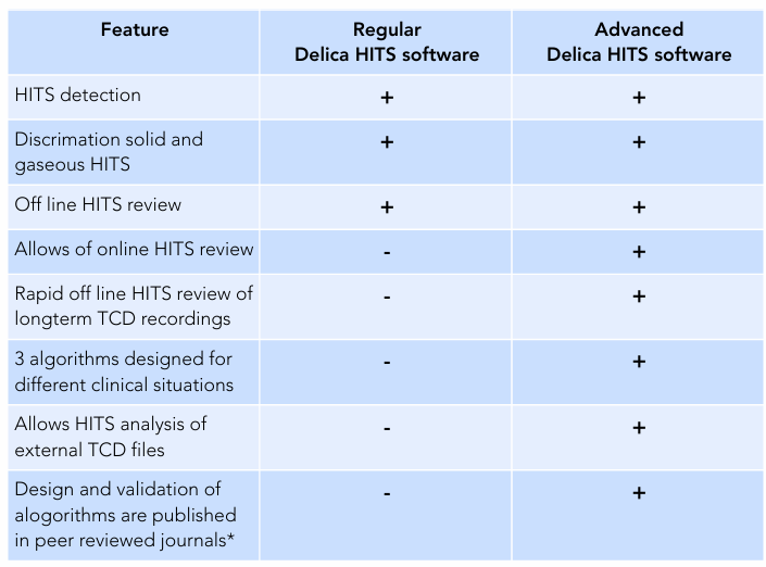 Accurate embolus recognition and analysis are among the key strengths of the Delica TCD systems. In addition to true MES, the TCD signal may also contain High-Intensity Transients (HITS) that arise from artifacts such as probe movements or speech. To address this, Delica offers two embolus detection software options: 1. 2. Regular Delica HITS software – the standard detection package included with all Delica TCD systems. Advanced Delica HITS software – a premium solution developed in collaboration with Dr. Keunen, a Dutch vascular neurologist and internationally recognized TCD expert. The Advanced Delica HITS software provides enhanced embolus detection accuracy and advanced analysis tools designed for clinical research and high-level diagnostic applications. The table below summarizes the main differences between the Regular and Advanced HITS software options. Depending on your clinical focus or research requirements, you can choose the standard configuration or upgrade to the Advanced Delica HITS detection system.