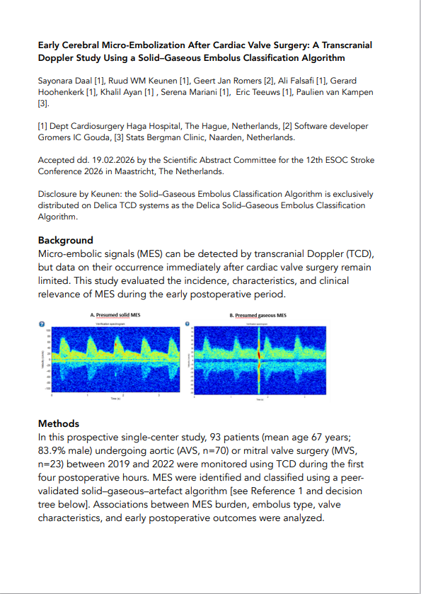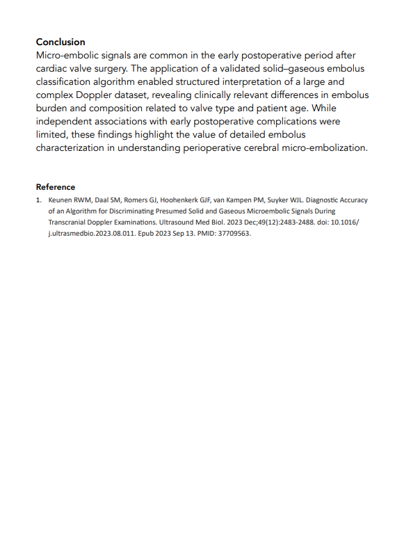 Considerable time and effort were invested in conducting this TCD study in more than 90 patients during the first hours following heart valve surgery. The investigators were very pleased to find that the SGA algorithm was able to reliably differentiate between gaseous and solid particles among thousands of HITS. This was particularly evident in the differences observed between mechanical heart valves—where a high number of gaseous particles is expected—and biological heart valves, where the ratio of gaseous to solid particles was nearly equal.